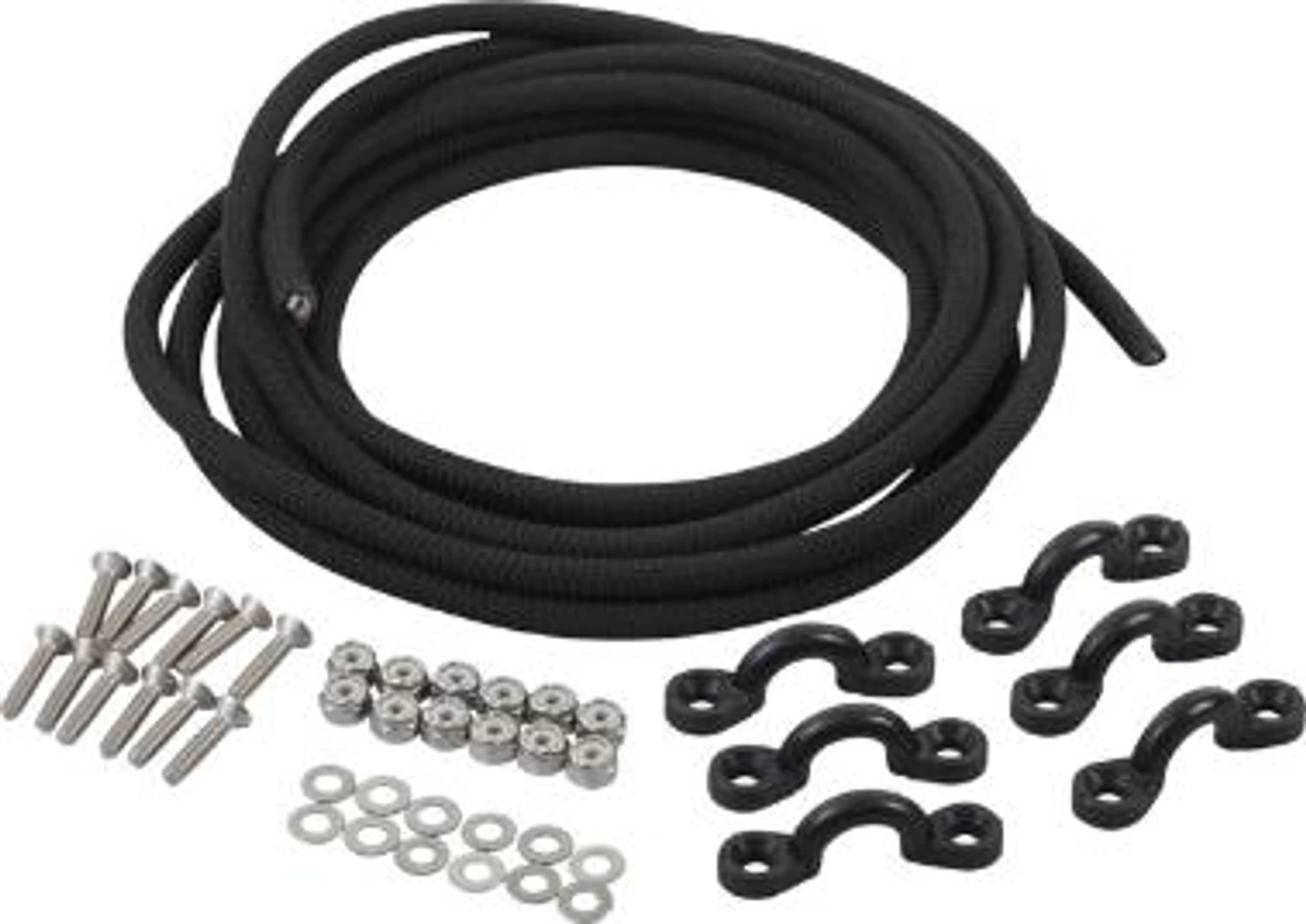 - Parts Included: 1/4″ bungee – 11′ (1) 3/8″ Pad Eye (6) 8-32 X 3/4″ OH (12) #8-32 Nyloc nut (12) #8 Flat washer (12)
