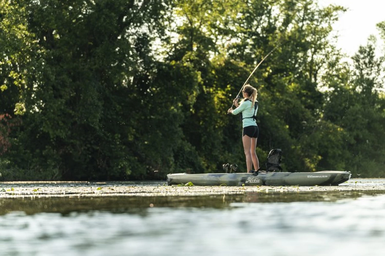 Simplicity defined, the Mirage Compass is powered by the MirageDrive 180 pedal system and Kick-Up Fins. Patented Kick-Up Fin Technology takes the worry out of kayaking in shallow, structure-filled waters by automatically retracting upon impact. New for 2022 is an anodized aluminum alloy frame seat offering incredible comfort, durability and breathability with monomesh and riptstop nylon construction. The Compass offers maximum stability and an oversized cockpit and flat deck for standing. A sharp turning radius makes this fishing kayak nimble in tight quarters, yet able to speed over open water in stealthy fashion. Kayak fishing features include pre-installed rod holders, H-Track accessory mounts and a transducer cavity ready for you to install a Lowrance® fishfinder. For a stealthy look, upgrade to the Compass Camo package that is outfitted with Kick-Up Turbo Fins and comes in Camo color.