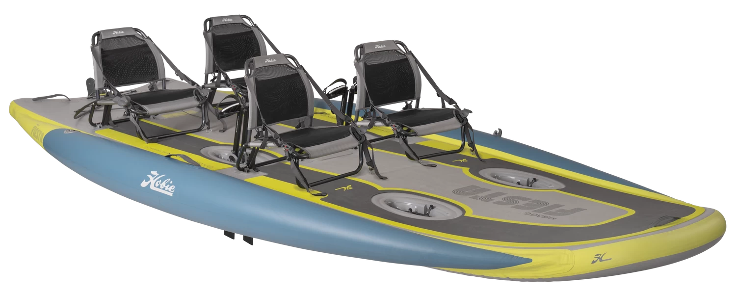If you’re looking to have some serious fun on your next family outing, look no further than the all-new Mirage iTrek Fiesta that will be arriving in early 2022. This one of a kind kayak is equipped with four comfortable seats, one easy-to-use steering system and powered by two MirageDrives with Glide Technology and Kick-Up Fins. But if you want even more power, you can easily upgrade and add two more MirageDrives with GT, delivering even greater speed and maneuverability. The Fiesta is the most unique watercraft on the market today. Its high-tech, 550 denier, triple-chamber construction delivers the same stability and rugged rigidity as a solid boat, but in a lighter package. The Mirage Fiesta is fast and a party on the water – but we didn’t stop there. It’s versatile, too. Simply turn the front two seats to face the back for integrated social seating, making it the perfect watercraft for spending time on the water playing games or putting your feet up and hanging out. A three-piece SUP paddle, high-pressure hand pump, high-volume electric pump and storage bag are all included along with the four seats and two MirageDrives with Glide Technology + Kick-Up Fins. Let’s get this party started!