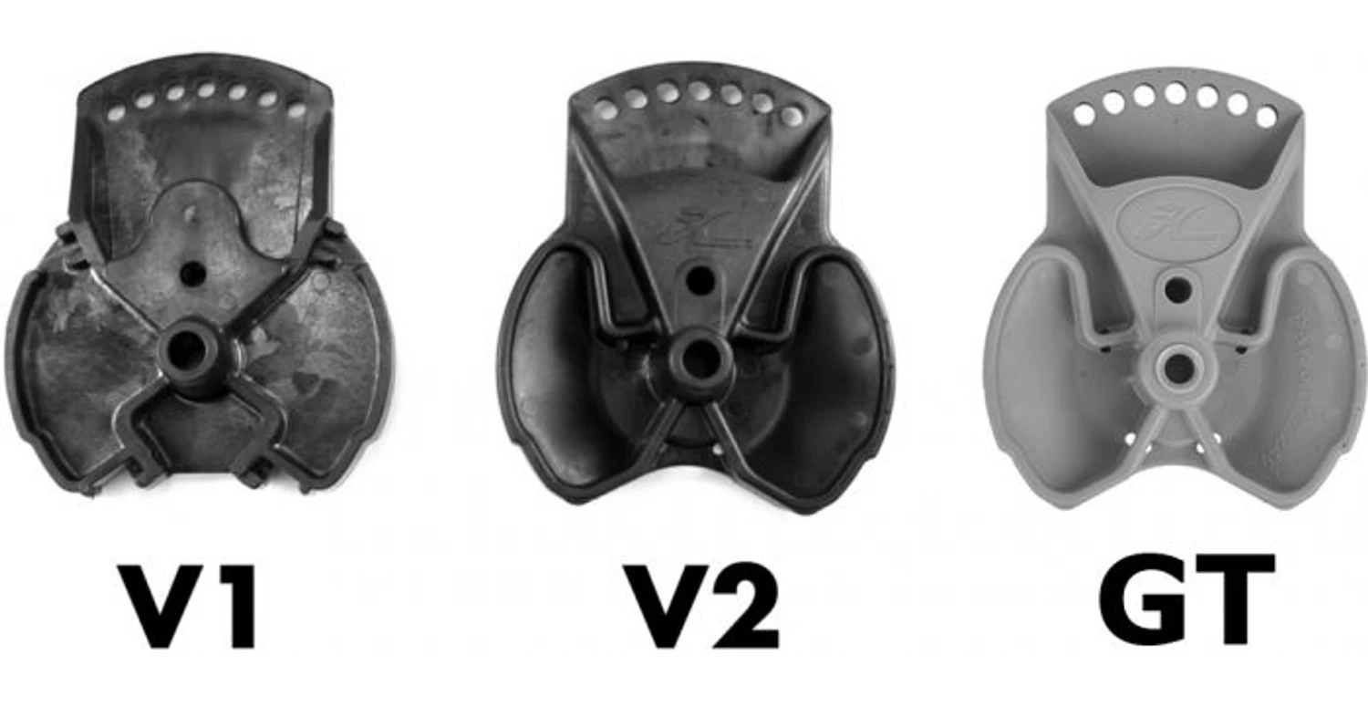 The Hobie Mirage Drive V1 to GT Upgrade Kit includes all the parts you need to upgrade your V1 drive into a GT drive. Replacement parts for the V1 Mirage Drive have been discontinued, if you need replacement parts, you must upgrade to a GT drive and use GT replacement parts. The easiest way to tell if you have a V1 drive is to look at the drum. If it looks like it has a guy dancing on it, it is a V1 drive; if it looks like it has ears it’s a GT drive. See the image for details. This kit will not upgrade the sprocket and masts to be able to use GT fins. Your V1 fins and sprocket will work with the V2 drive.