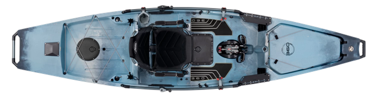 Pivoting Tackle Management System: A rectangular hatch just in front of the seat conceals a mesh storage pocket and pivoting storage for two medium-sized Plano® tackle boxes (included). The storage area under the tackle boxes is also easily accessible.