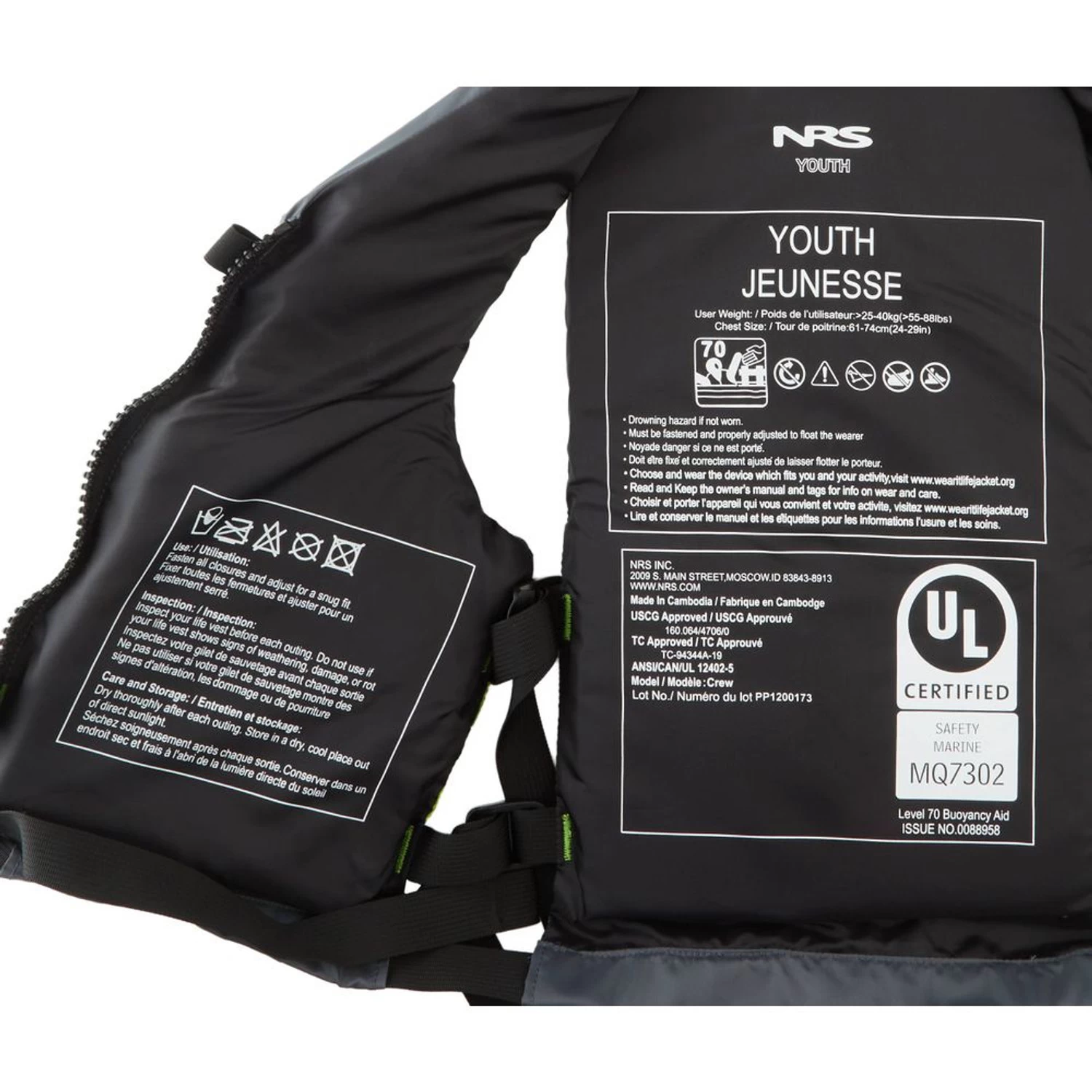 - The Youth Crew life jacket is rated for users weighing 55-88 pounds and having chest measurements of 24″-29″ (including apparel layers)