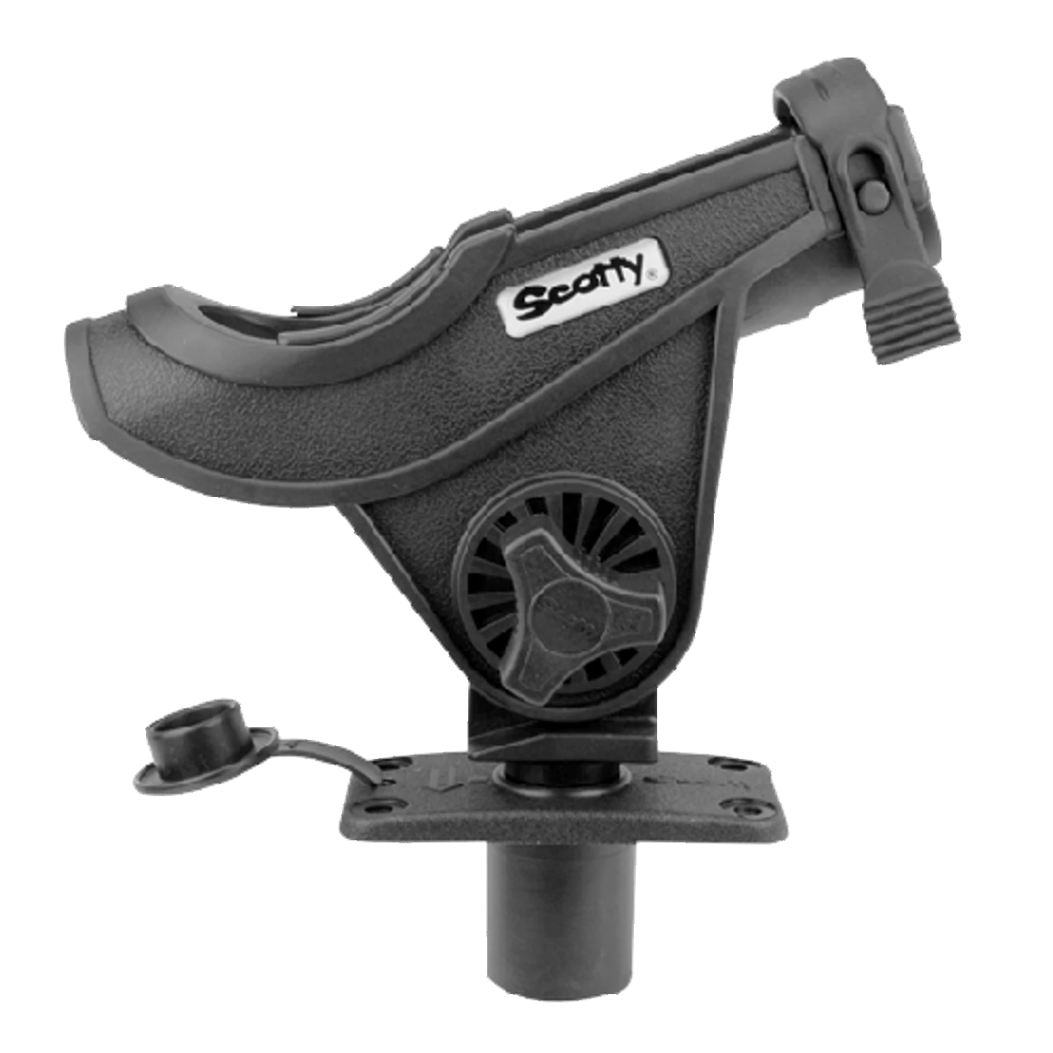 Holds a bait caster reel in a cushioned cradle. A slot in the front of the rod holder allows for a spinning reel to be securely held in position. The rod holder design has a side mounted flange, which leaves the bottom open. This allows for the rod holder to accommodate trigger grips. Pistol grip rod butts easily clear the sides of the rod holder for quick rod retrieval. Rod can be secured in holder with a soft latching strap which snaps over the top. Includes a No. 244 Flush Deck Mount which has a sealed base for watertight applications (such as kayak decks).