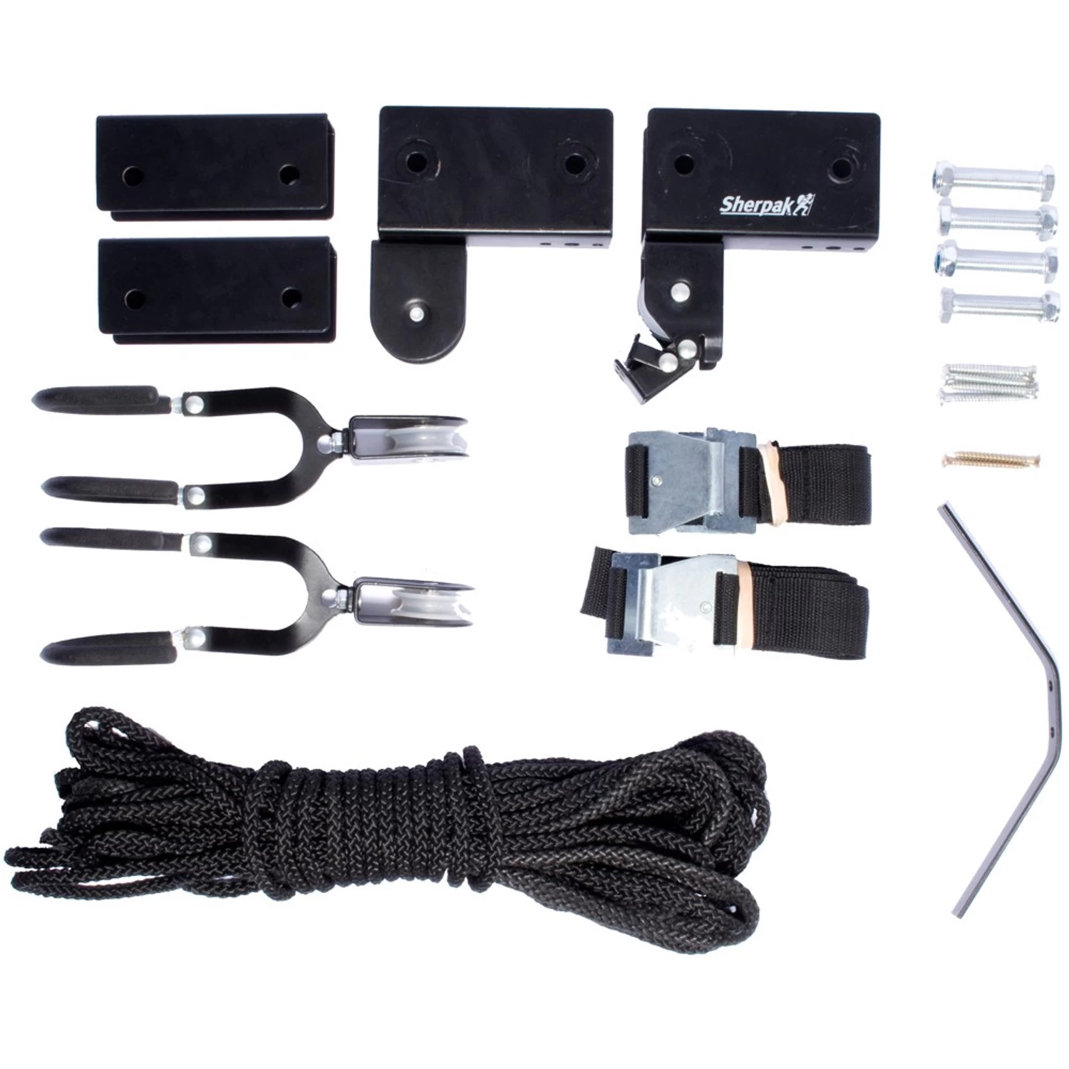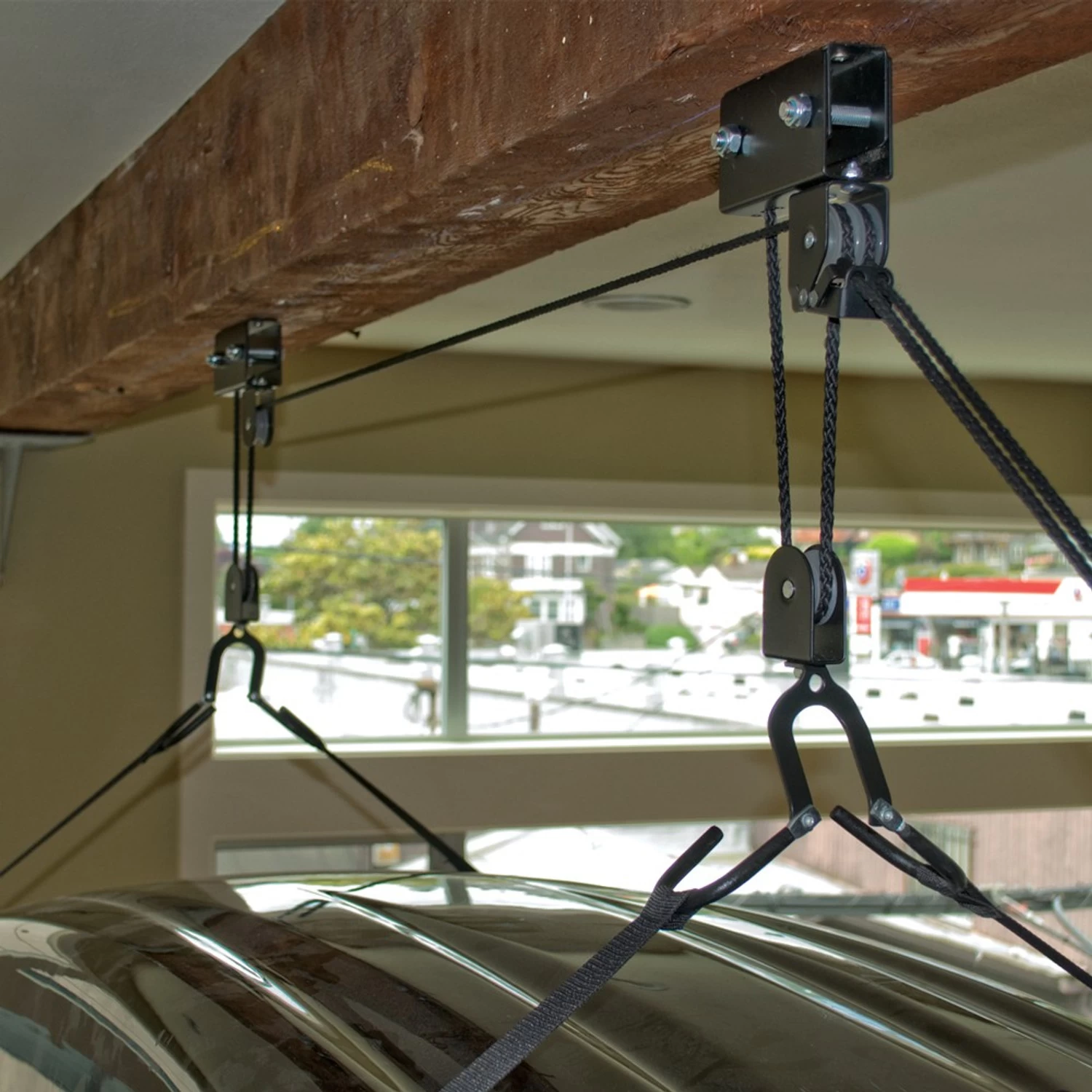 - Use this heavy-duty pulley and rope system to suspend and store bikes, storage boxes or boats up off the floor.