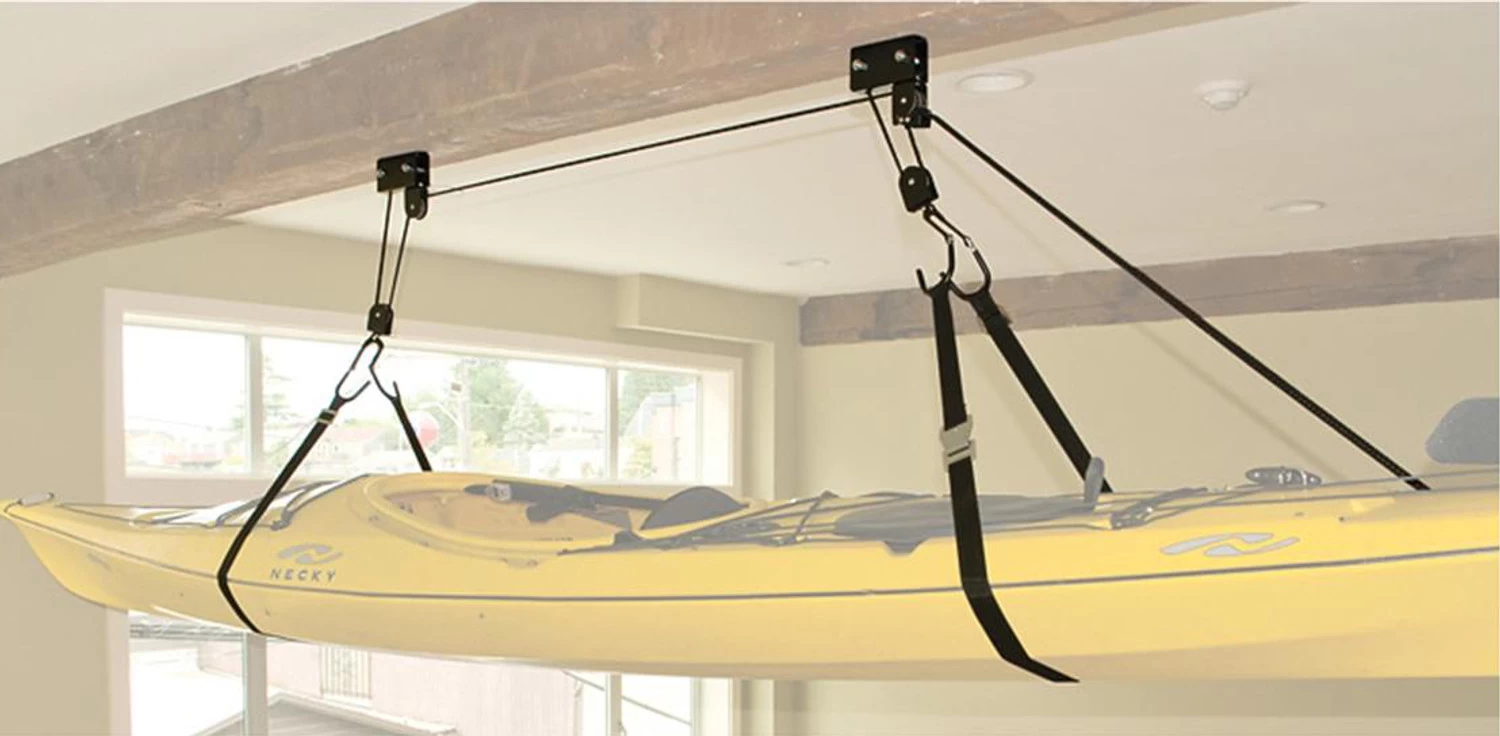 Use this heavy-duty hoist for lifting bikes,storage boxes or boats to the ceiling of your garage.