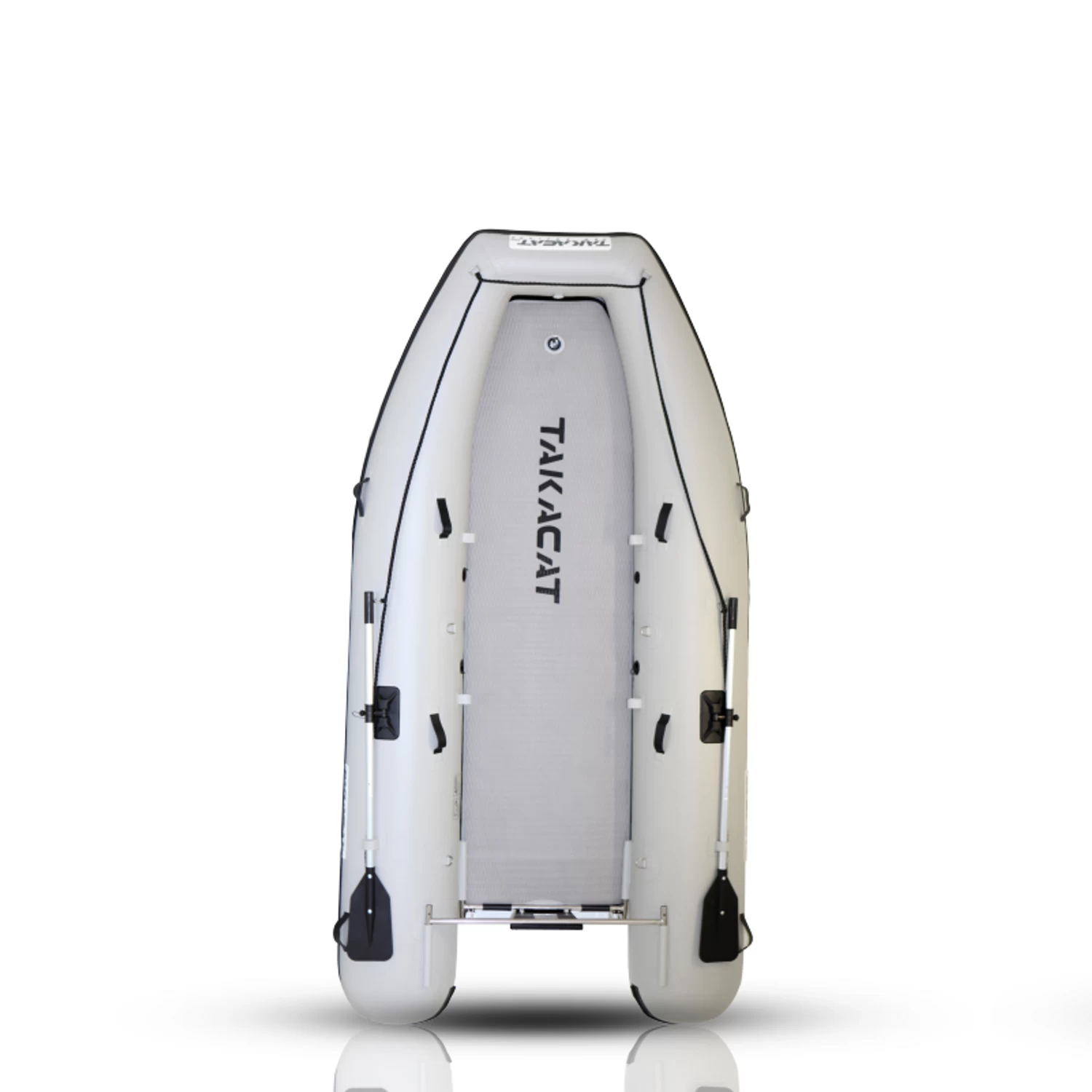 2. The revolutionary open bow design of the Takacat ensures safety and comfort when boarding and disembarking. Both the conventional hybrid fibreglass rigid floor and the high-pressure inflatable air floor offer an incredibly stable platform for boarding and disembarking from land or water.