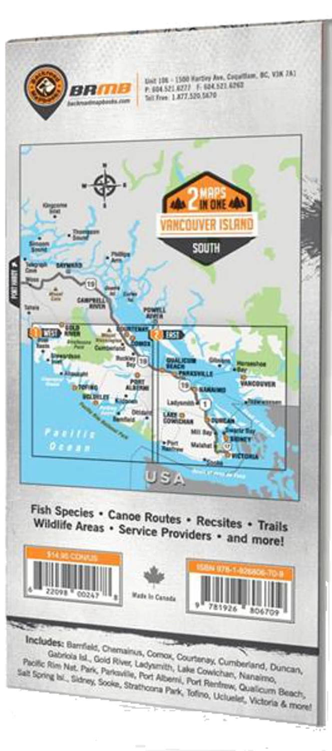 To help you discover the best of Southern Vancouver Island, the BRMB team has worked tirelessly to create the most comprehensive, detailed and easy to use map for Southern Vancouver Island you will find anywhere. This dual sided 34” x 46.25” map is printed on durable, waterproof paper to withstand anything Mother Nature throws at you. With industry-leading cartographic detail, sate-of-the-art relief shading, UTM and longitude/latitude grid, colour coded Provincial Parks, Wildlife Management Units, Recreation Sites and more, you can stay focused on your adventure and not on trying to decipher a hard-to-read map. This map is jam-packed with points of interest, hiking trails, campsites, paddling routes and more, so no matter what your favourite outdoor activity is, we’ve got you covered. This map also features detailed s of recreation sites and parks with information on camping, fees, activities, access and more. Covering the areas around Duncan, Tofino, Bamfield, Victoria, the Gulf Islands and more, this is a must-have for any Vancouver Island adventure.