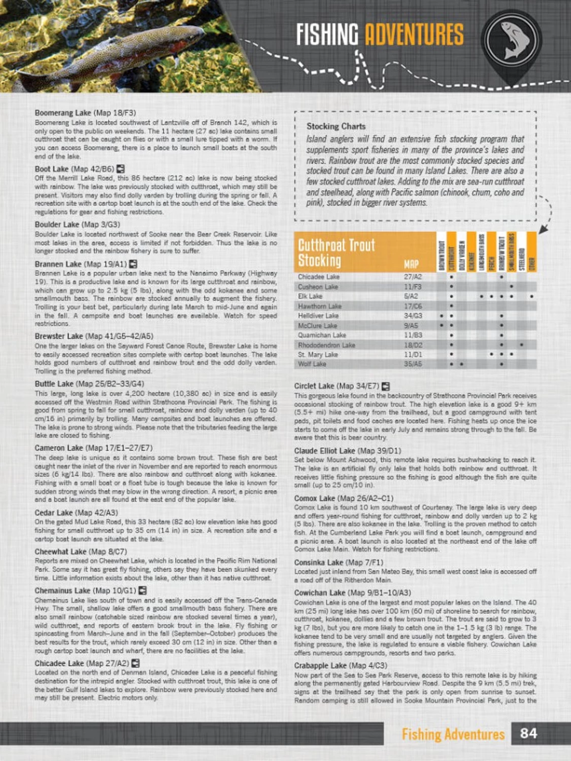 The 8th edition of our Vancouver Island Backroad Mapbook features extensive updates and upgrades from our last publication. These include the addition of private land, fish species, higher resolution for wildlife management units, enhanced and updated resource roads, cartographic symbol updates, multi-use trail and fish stocking charts and four new maps at 1:150,000 base scale, as well as an inset map of the Sayward Canoe Route. As usual, we have also expanded and refined our written Adventure listings to get you the most up-to-date and accurate information possible for your adventure of choice.